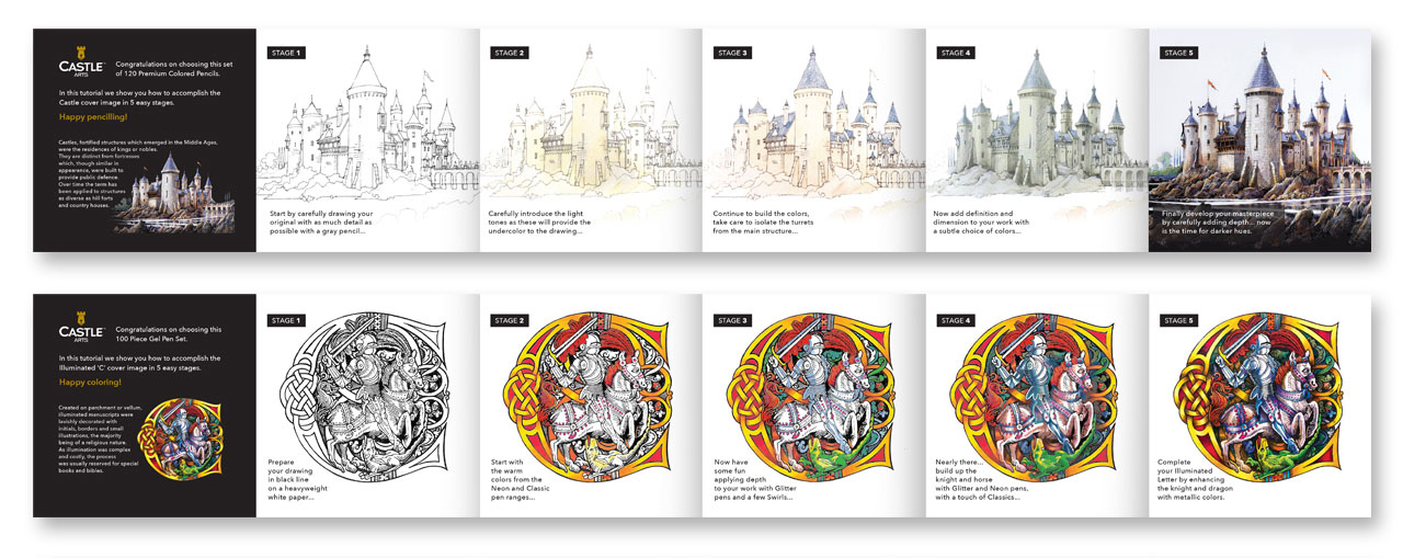 Ongoing design for the product packaging, tutorial literature, and marketing materials for Castle Arts, an arts media manufacturer, involves a blend of aesthetics, know-how, functionality, and brand representation.
